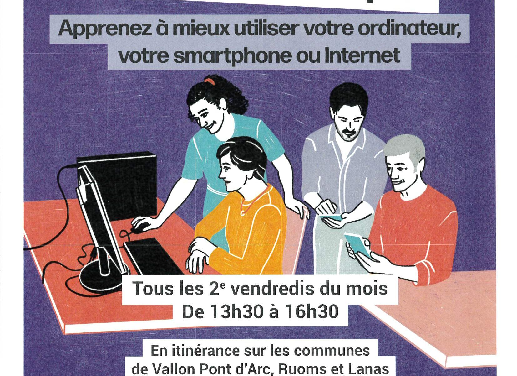 Le centre social et culturel propose un atelier numérique tous les 2ème vendredis du mois de 13h30 à 16h30 en itinérance sur les communes de Vallon Pont d’Arc, Ruoms et Lanas.
